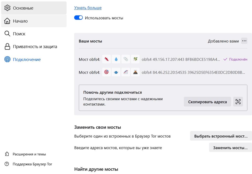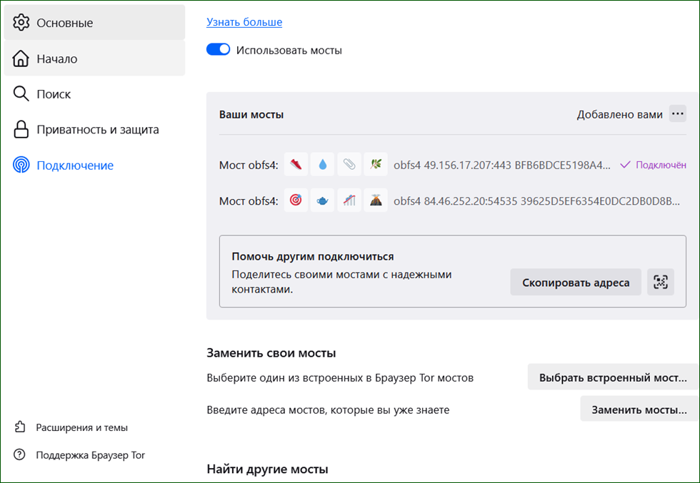 Скопируйте полученные строки мостов (выглядят как obfs4 123.45.67.89:443 ...).