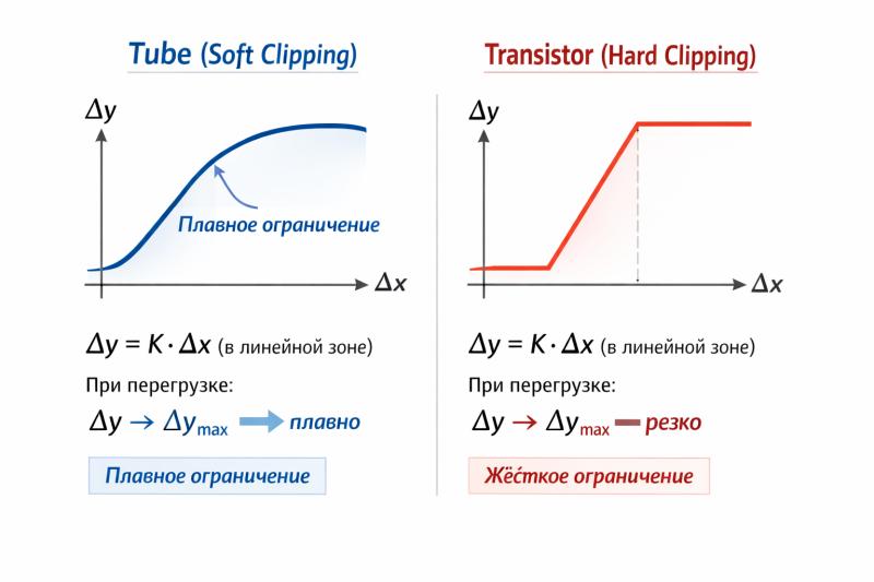 Плавное ограничение (указано синим): "Плавное ограничение". Это означает, что при перегрузке лампа не "обрезает" сигнал резко, а сжимает его (компрессия). Выходной сигнал продолжает расти, но всё медленнее, приближаясь к пределу ассимптотически.
